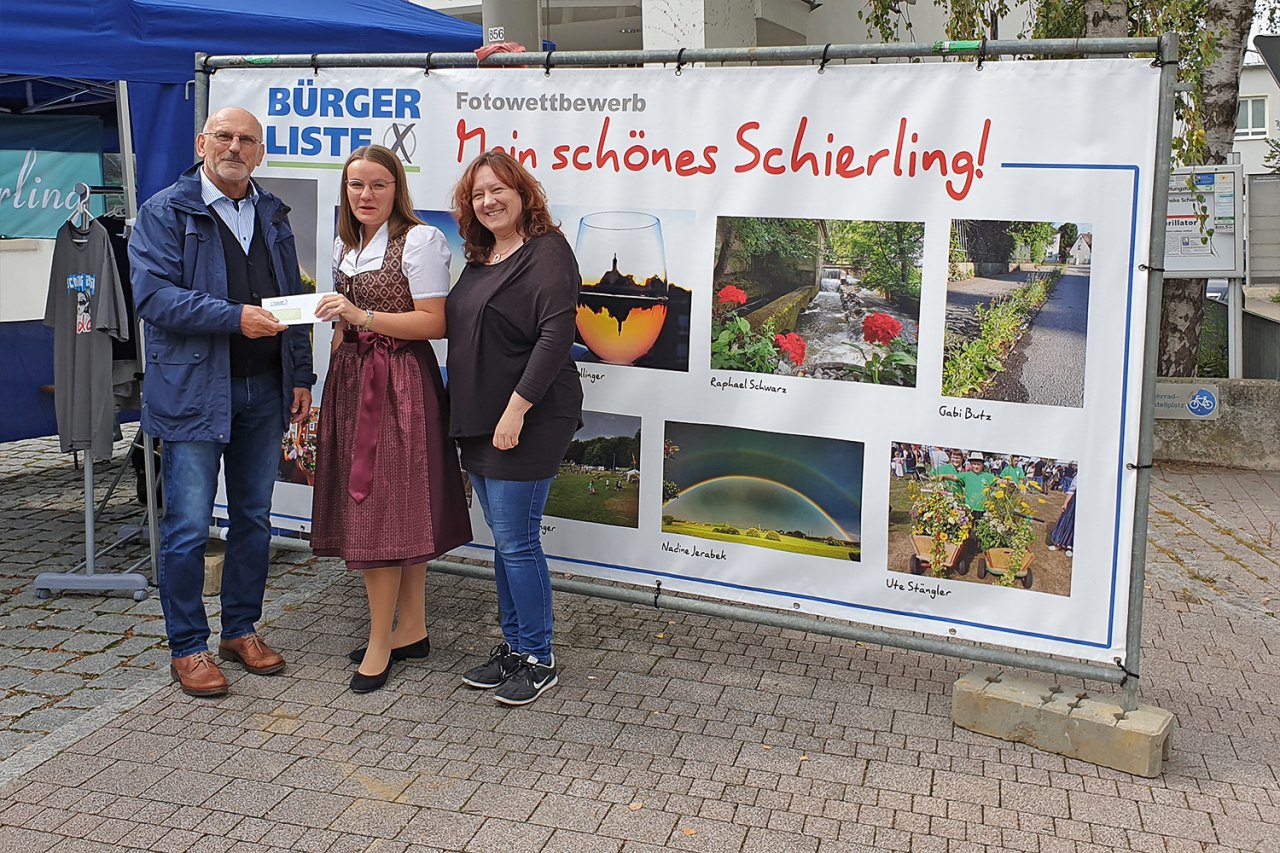 Im Rahmen des diesjährigen Schierlinger Herbstmarkts wurde das Siegerfoto des Fotowettbewerbs der Bürgerliste prämiert. Den ersten Platz sicherte sich mit seinem Motiv “Schierlinger-Festdamen beim Festzug zum 150 jährigen Gründungsfest der Feuerwehr Schierling“ Fritz Wallner. Den zweiten Rang belegte mit nur einer Stimme Differenz zum Erstplatzierten Helga Sollinger mit Ihrem Schnappschuss „Schierling im Weinglas“. Auf den dritten Platz votierten die Schierlinger den „Blühstreifen in der Bachstraße“, fotografiert von Gabi Butz.